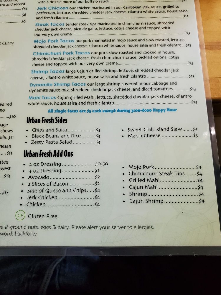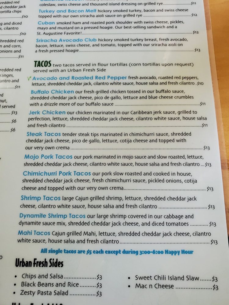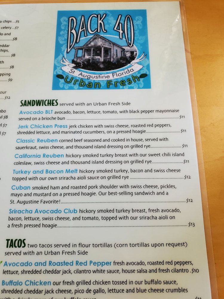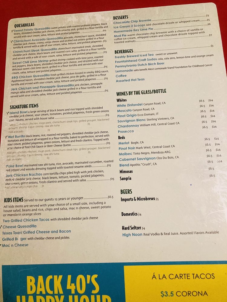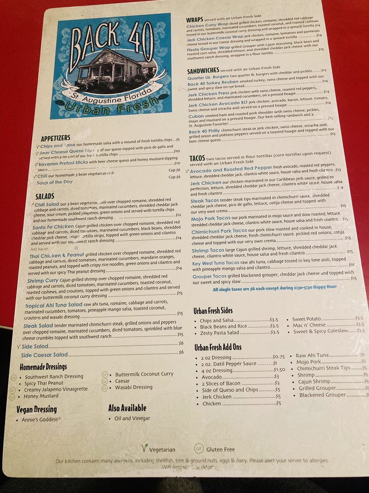 Introducing the menu at Back 40 Urban Cafe, located in St. Augustine, Florida, where Caribbean, Mexican, and vegetarian cuisine come together. This cozy cafe offers a diverse selection of appetizers like Chips And Salsa, Soup of the Day, and Beer Cheese Queso Dip. Enjoy wraps such as Chicken Curry Wrap and Jerk Chicken Caesar Wrap, along with delicious quesadillas like Sweet Potato Quesadilla and Chimichurri Avocado Quesadilla. Customers praise the warm ambiance and friendly service, making it a charming spot for a meal. With a nostalgic 50s diner feel and ample parking, Back 40 Urban Cafe delights patrons with dishes like Grouper Tacos and Cuban Sandwiches. Don't miss out on this hidden gem for a heartwarming dining experience.