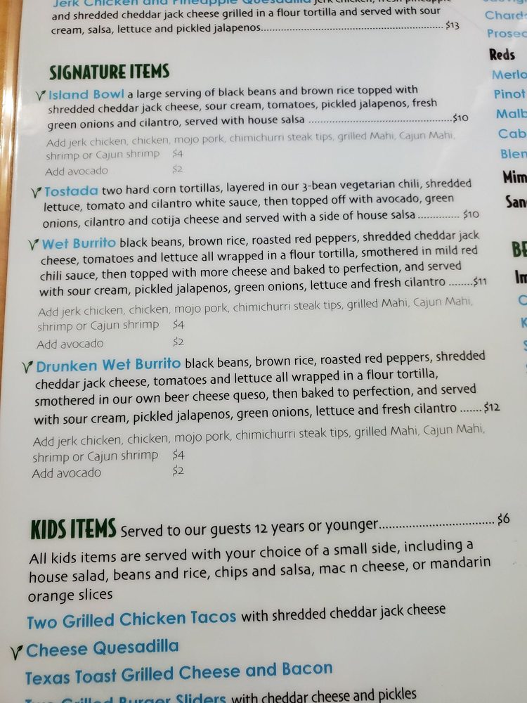 Gluten-free modification. Our chicken marinated in our caribbean jerk sauce, grilled to perfection, lettuce, shredded cheddar jack cheese, cilantro white sauce, house salsa and fresh cilantro